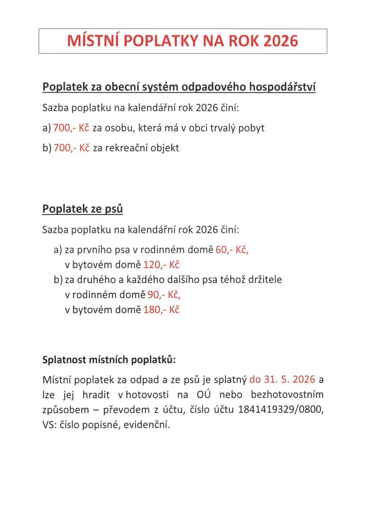 Místní poplatek je splatný do 31. 5. 2026 a lze jej hradit v hotovosti na OÚ nebo bezhotovostním způsobem – číslo účtu 1841419329/0800, VS: číslo popisné, evidenční.