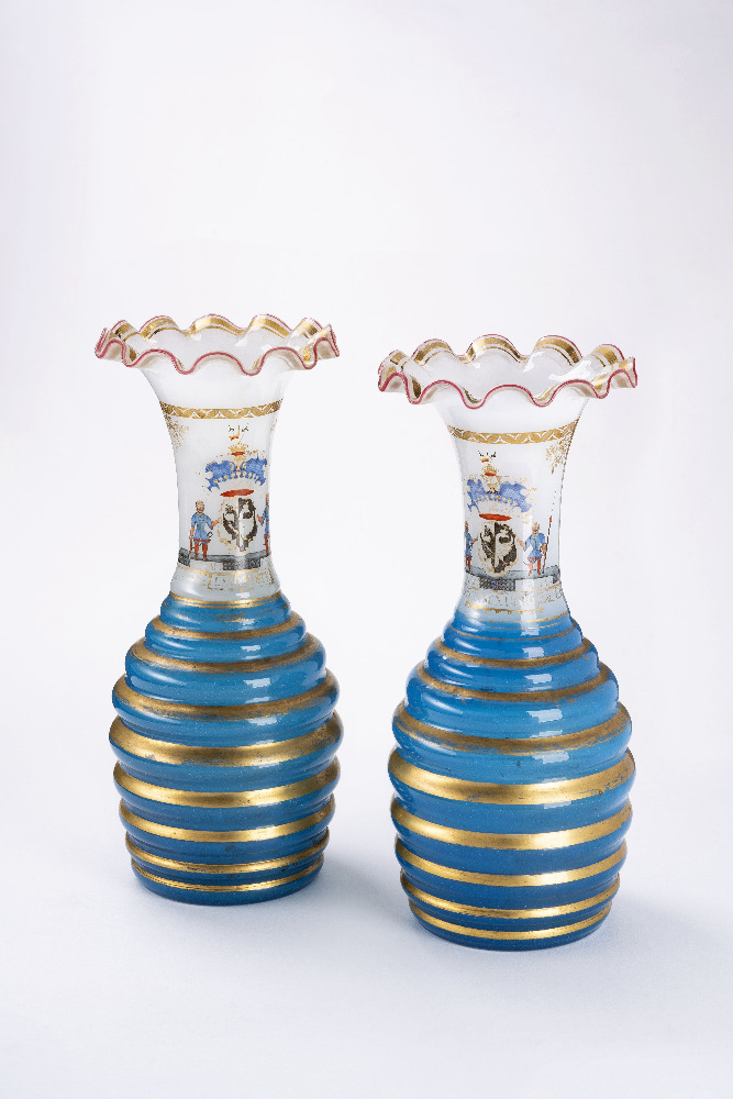 Dvojice skleněných váz s erbem hrabat Razumovských, dar zaměstnanců sklárny v Rožnově u Českého Rudolce majiteli manufaktury a panství hraběti Leonu Razumovskému, kolem roku 1850 - soukromá sbírka, foto SZM