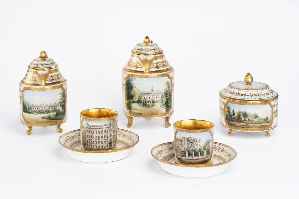 Porcelánový čajový servis, tzv. přátelská souprava zdobená malbami vedut paláců ve Vídni a Opavě a zámků v Radkově, Melči a Dolních Životicích, dar k 25. výročí svatby hrabat Camilla a Marie Razumovských, rok 1907 - soukromá sbírka, foto SZMPorcelánový ča