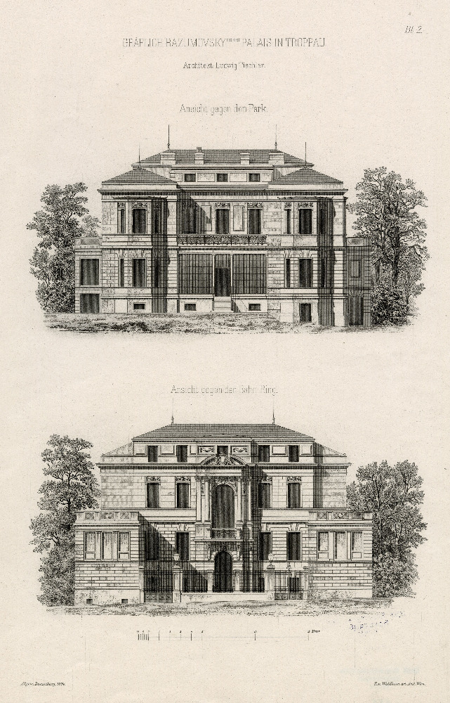 Ludwig Tischler (1840–1906), zahradní a uliční průčelí novostavby městského paláce Razumovských v Opavě, publikováno v Allgemeine Bauzeitung, rok 1895 - soukromá sbírka, foto SZM