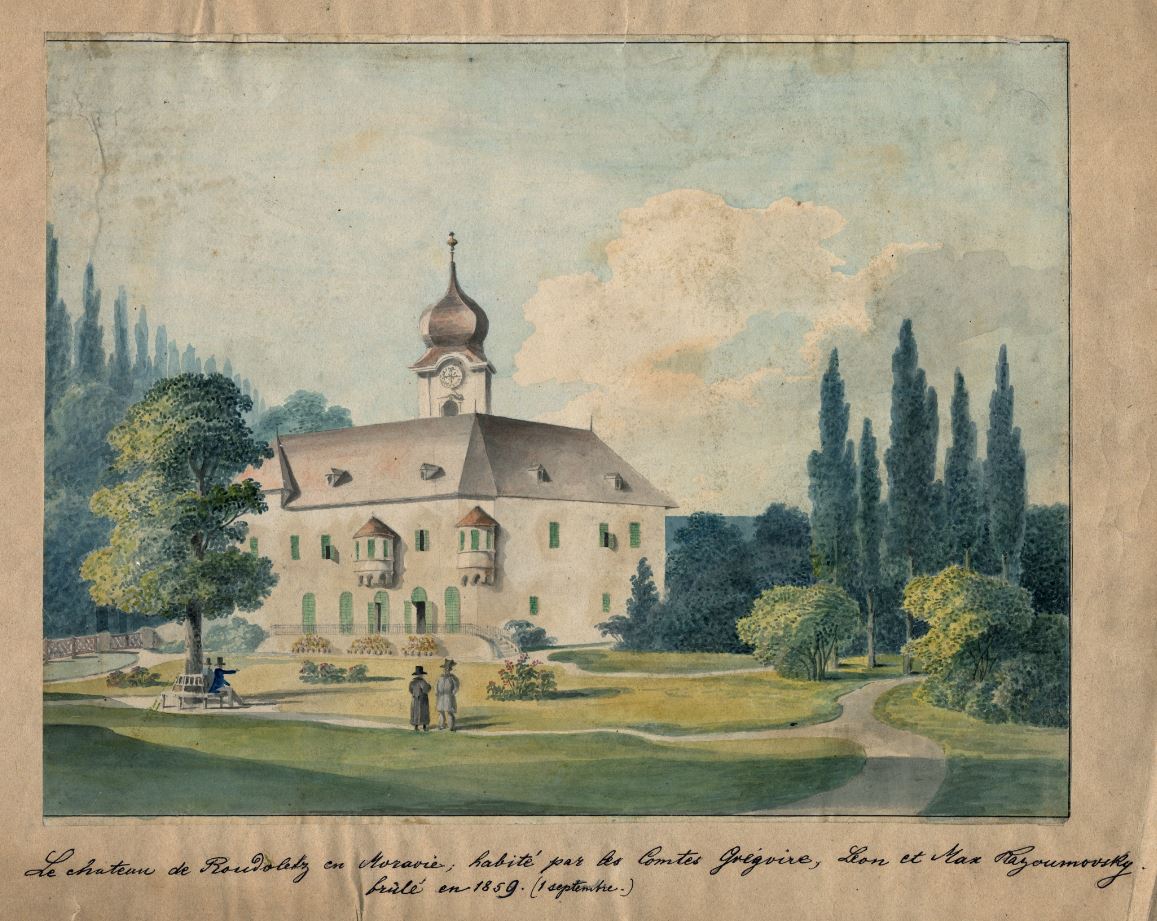 Veduta zámku v Českém Rudolci před novogotickou rekonstrukcí, rok 1859, akvarel na papíře, francouzský přípis zmiňuje jako obyvatele zámku hrabata Gregora, Leona a Maxe Razumovské - soukromá sbírka, foto SZM