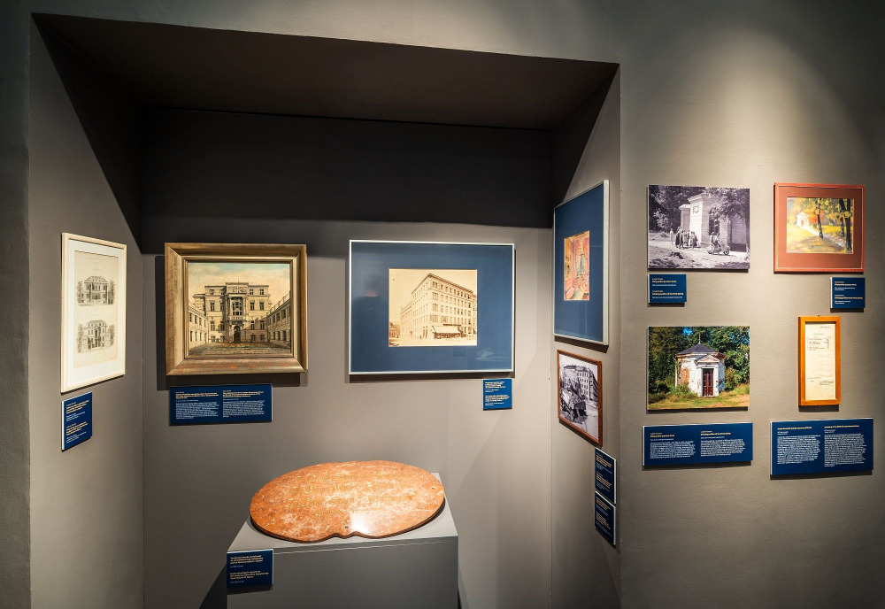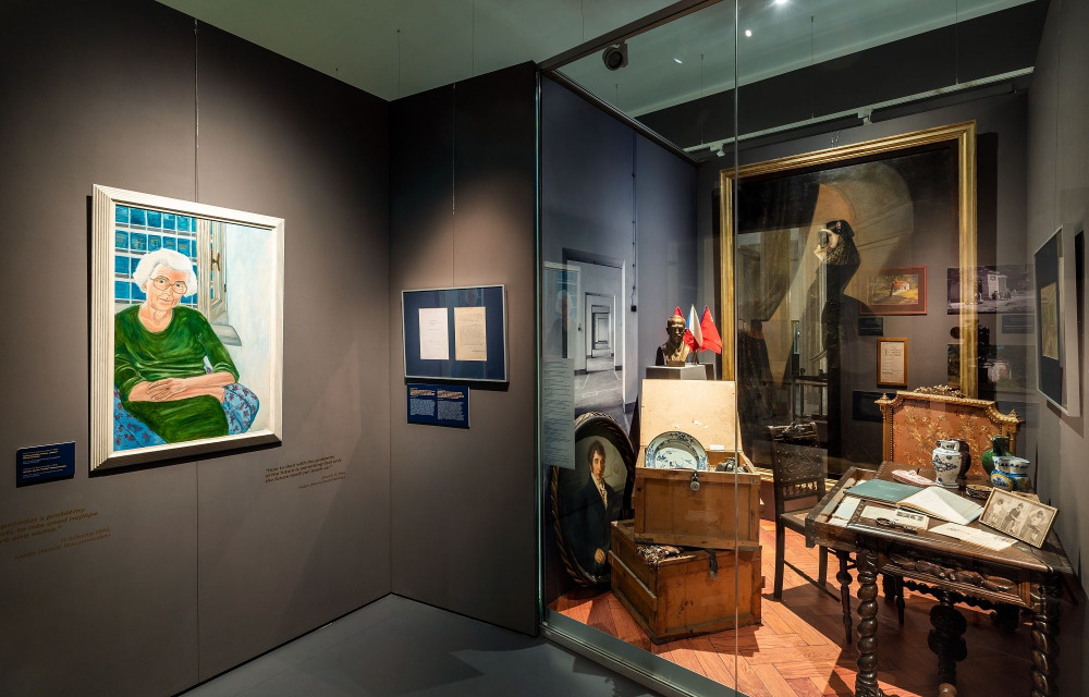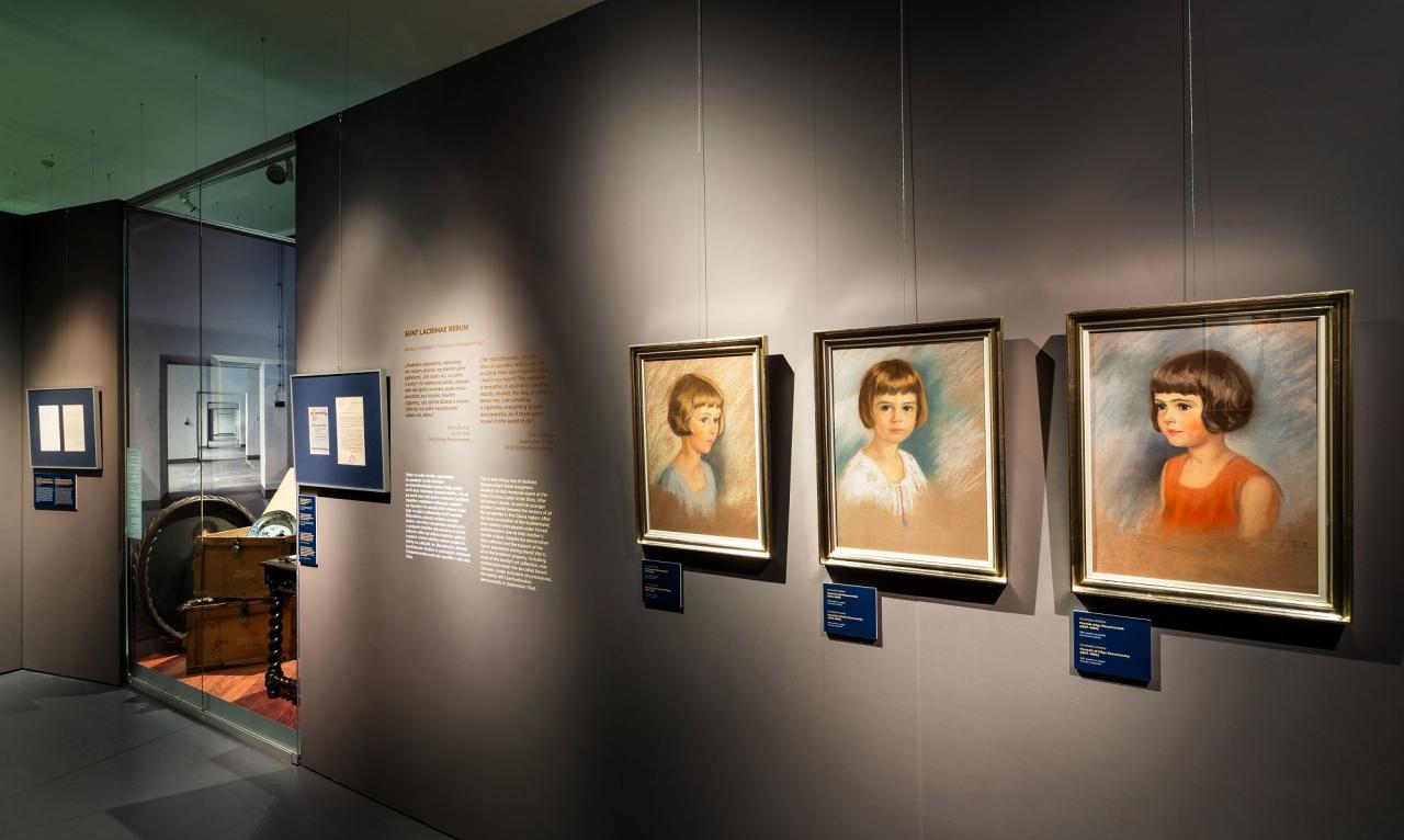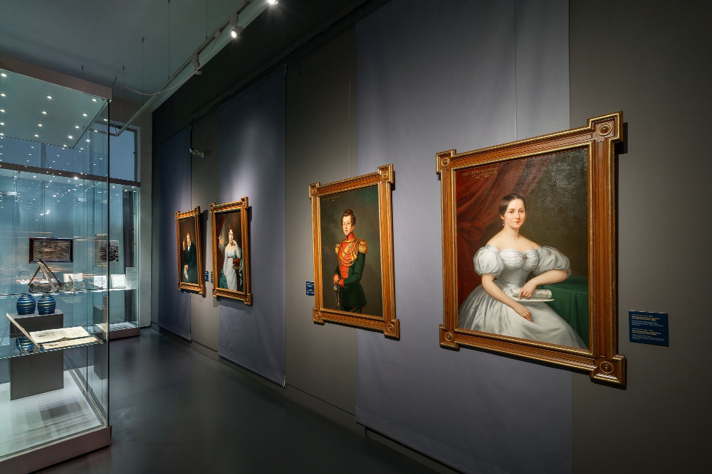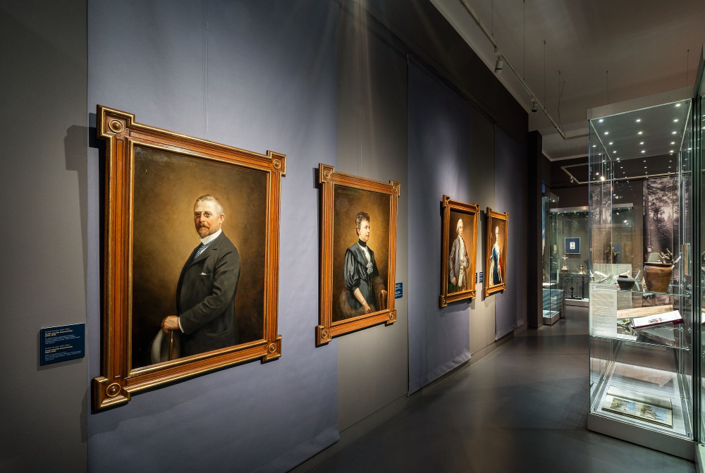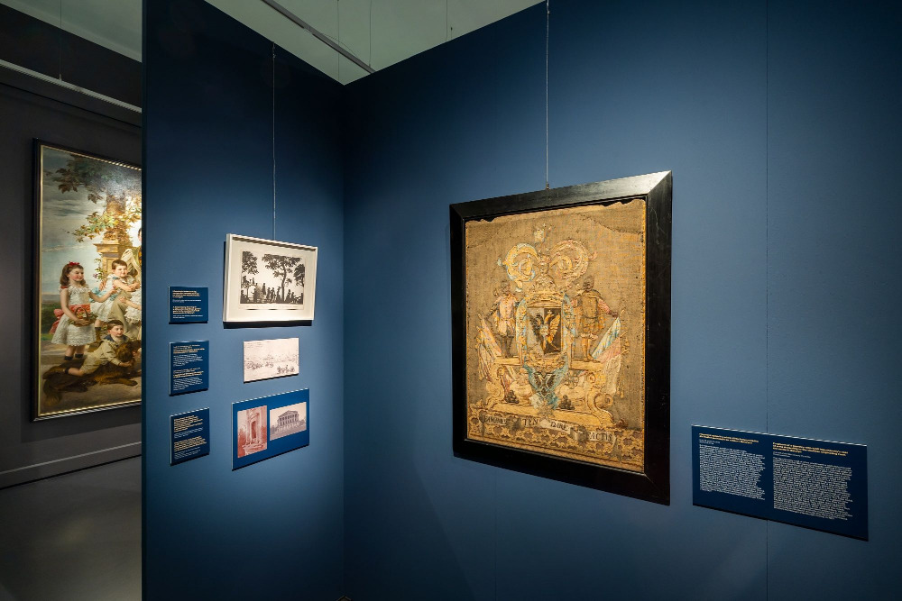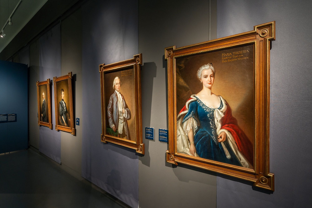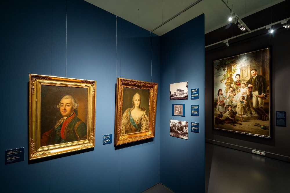 Expozice výstavy: v popředí zleva - Rudolf Templer (1837–1905), hrabě Camillo Razumovský a hraběnka Marie Razumovská, roz. Wiener von Welten 90. léta 19. století, z původní rodové portrétní galerie zámku Radkov-Dubová - Národní památkový ústav – Státní zá